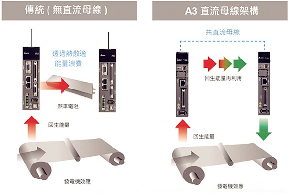 多臺(tái)驅(qū)動(dòng)器使用共直流母線功能,節(jié)省煞車電阻使用數(shù)量,降低成本