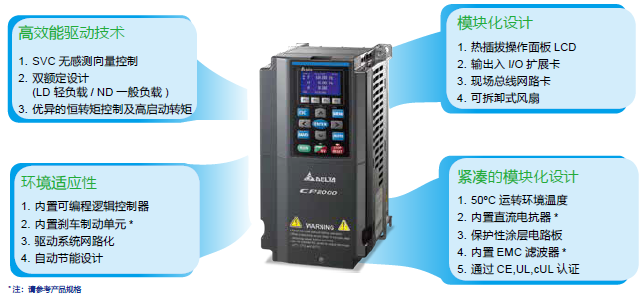 CP2000系列為無感矢量控制變頻器,延續(xù)臺達設計團隊對節(jié)能省電理念的一貫性,針對風機、水泵、HVAC Drive相關應用特制化、PID智能調適和優(yōu)異設計的產(chǎn)業(yè)效能所推出的變頻器。其無感矢量控制(SVC)的智能表現(xiàn),適時提升負載轉矩響應,滿足客戶寬廣的變轉矩負載需求,提升馬達在一般用途的效能。3段式V/F冪級曲線響應,能在變動轉矩負載的環(huán)境下,適時的調整輸入電壓來提高整體效能,特別是水泵,風機負載之類的應用。FLYING START、自動加減速功能、瞬時停電再啟動,馬達參數(shù)AUTO-TUNING等功能,對變轉矩負載的環(huán)境操作及保護,提供適當?shù)倪\行及節(jié)能方桉。?