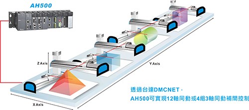 AH500的優(yōu)異運(yùn)動(dòng)控制功能,可實(shí)現(xiàn)任意三軸直線補(bǔ)間、任意兩軸圓弧補(bǔ)間、及任意三軸螺旋補(bǔ)間與連續(xù)補(bǔ)間功能,透過臺達(dá)DMCNET高速通訊網(wǎng)絡(luò)架構(gòu),可達(dá)到1ms的指令周期內(nèi)12軸同動(dòng)或4組3軸同動(dòng)補(bǔ)間功能。無論是復(fù)雜的過程控制或是精密的運(yùn)動(dòng)控制需求,都能透過AH500來實(shí)現(xiàn),有效應(yīng)用于各種產(chǎn)業(yè)機(jī)臺,如建材機(jī),經(jīng)編機(jī),食品包裝機(jī)等等。