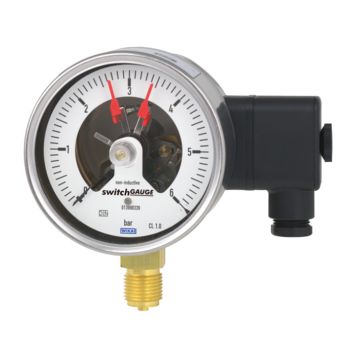 開(kāi)關(guān)電接點(diǎn)(報(bào)警用電子式電接點(diǎn))可根據(jù)儀表的指針位置接通和關(guān)斷電氣控制電路。開(kāi)關(guān)電接點(diǎn)在全量程范圍內(nèi)可調(diào)(參見(jiàn)DIN 16085)。通常情況下,電接點(diǎn)都安裝在表盤下面,只有少數(shù)是安裝在表盤上面。儀器指針(實(shí)際值指針)可在整個(gè)量程范圍內(nèi)自由旋轉(zhuǎn),與設(shè)定無(wú)關(guān)。